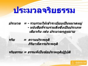 ประมวล = – รวบรวมให้เข้าระเบียบเป็นหมวดหมู่ – หนังสือที่รวบรวมสิ่งซึ่งเป็นประเภท เดียวกัน เช่น ประมวลกฎหมาย. จริย = ความประพฤติ กิริยาที่ควรประพฤติ จริยธรรม = ธรรมที่เป็นข้อประพฤติปฏิบัติ 4.