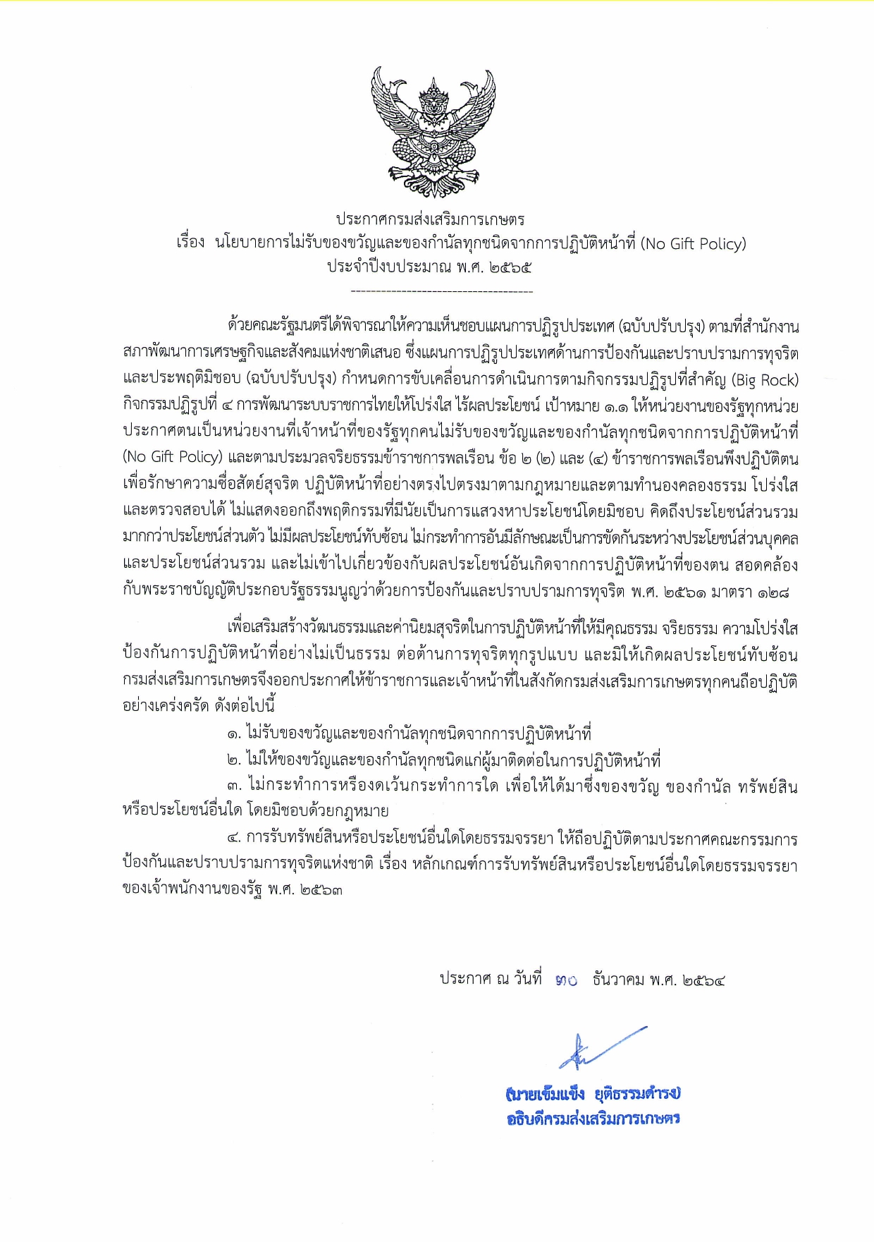 ประกาศกรมส่งเสริมการเกษตร เรื่อง นโยบายการไม่รับของขวัญและของกำนัลทุกชนิดจากการปฏิบัติหน้าที่ (No Gift Policy) ประจำปีงบประมาณ พ.ศ. 2565