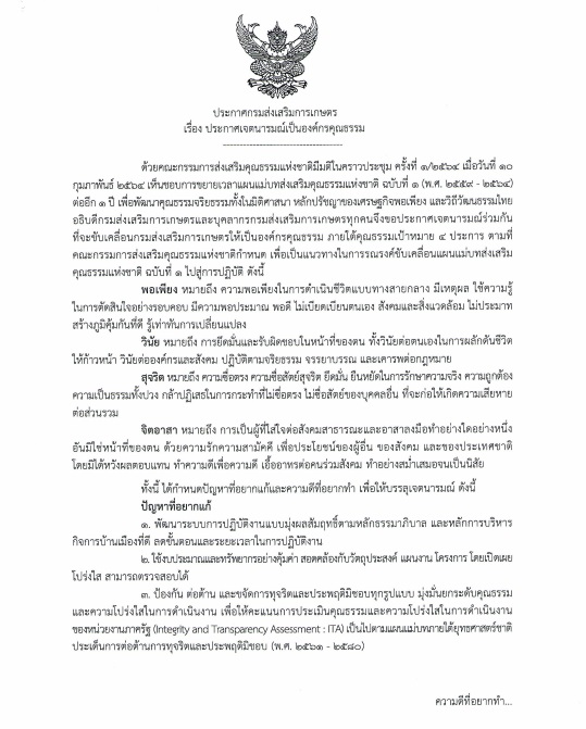ประกาศกรมส่งเสริมการเกษตร เรื่อง ประกาศเจตนารมณ์เป็นองค์กรคุณธรรม