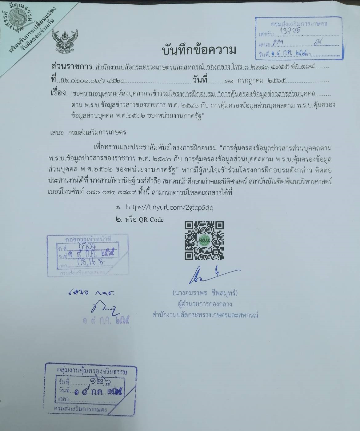 ขอเชิญ ข้าราชการ กรมส่งเสริมการเกษตร ผู้สนใจเข้าร่วมโครงการฝึกอบรม “การคุ้มครองข้อมูลข่าวสารส่วนบุคคลตาม พ.ร.บ. ข้อมูลข่าวสารของราชการ พ.ศ. 2540 กับ การคุ้มครองข้อมูลส่วนบุคคลตาม พ.ร.บ. คุ้มครองข้อมูลส่วนบุคคล พ.ศ. 2562 ของหน่วยงานภาครัฐ”