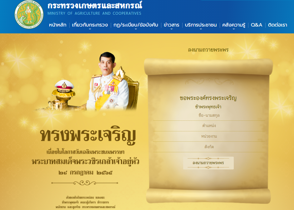 ขอเชิญร่วมลงนามถวายพระพร เนื่องในโอกาสวันเฉลิมพระชนมพรรษา พระบาทสมเด็จพระวชิรเกล้าเจ้าอยู่หัว 28 กรกฎาคม 2565 ทางเว็บไซต์กระทรวงเกษตรและสหกรณ์