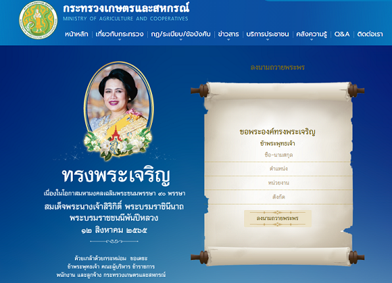 ขอเชิญร่วมลงนามถวายพระพร เนื่องในโอกาสมหามงคลเฉลิมพระชนมพรรษา 90 พรรษา สมเด็จพระนางเจ้าสิริกิติ์ พระบรมราชินีนาถ พระบรมราชชนนีพันปีหลวง 12 สิงหาคม 2565 ทางเว็บไซต์กระทรวงเกษตรและสหกรณ์ https://www.moac.go.th/moac-wellwishes-id-432991791794