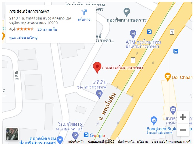 กรมส่งเสริมการเกษตร เลขที่ 2143/1 ถนนพหลโยธิน แขวงลาดยาว เขตจตุจักร กรุงเทพมหานคร 10900 โทรศัพท์ 0 2940 6056
